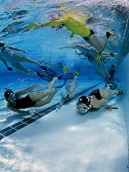 Sport collectif qui se pratique dès 8 ans, le Hockey Subaquatique utilise l’apnée sur le fond d’une piscine entre 2 et 4 mètres de profondeur. Chacune des équipes est constituée de six joueurs dans l’eau et de quatre remplaçants qui peuvent entrer en jeu à n’importe quel moment de la partie sur la demande d’un joueur, mais uniquement lorsque celui-ci se trouve hors de l’eau.
