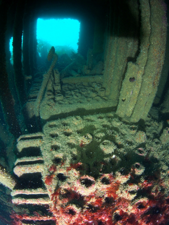 Il faut le dire tout de suite, elles ont fait autant sinon plus de victimes, parmi les plongeurs, que la profondeur. Quand on entre dans une épave, pour en sortir ensuite, il faudra souvent effectuer tout le même parcours, en sens inverse. En cas d’urgence (panne d’arrivée d’air), cela peut être trop long. De plus, elles regorgent d’endroits coupants et de saillants pouvant sectionner un tuyau ou le bloquer. Si elles contiennent de la vase ou du sable très fin, il se soulève avec le palmage, pouvant amener à se perdre et à ne plus retrouver la sortie, même si l’on a un éclairage à sa disposition (le fil d’Ariane, déroulé à l’aller, est indispensable). Autre piège, dans les épaves les plus rouillées : le panneau qui se déplace brusquement, ou bien la plaque du plafond qui s’abaisse, et qui viennent couper la retraite vers l’issue d’entrée. Des filets peuvent traîner dans certains cales, jouant alors le même rôle qu’une toile d’araignée géante… Se contenter de la parcourir de l’extérieur est donc fortement conseillé, en veillant à la présence possible des obstacles dont nous venons de parler (filets, arêtes coupantes…). Ces précautions prises, il est vrai que c’est un thème très photogénique, avec son atmosphère très particulière, mélange d’une présence humaine à travers cet objet manufacturé, et des espèces endémiques qui vont vite l’adopter et de plus en plus la coloniser, pour finir par la faire totalement disparaître sous les algues et les concrétions diverses. Les dimensions de tout navire, même assez petit, rendent normalement impossible sa « couverture » par un flash électronique. Ce qui amène à travailler en lumière naturelle, au moins pour la vue d’ensemble (si la transparence de l’eau donne une visibilité suffisante sur toute son étendue). Pour avoir des images de qualité, et de profondeur de champ suffisante, l’on pourrait envisager l’emploi d’un pied photographique (lourdement lesté), et un travail en vitesses lentes ou en pose B. Autre possibilité, le jour et surtout de nuit, faire de l’open flash, toujours en pose B, tandis qu’un plongeur déclenche le flash électronique, en divers endroits du bateau, successivement. Mais, en veillant bien à ne pas se placer entre l’éclair et l’appareil photographique sous peine d’être visible sur l’image, comme une silhouette noire. Encore une fois, sauf effet volontaire.